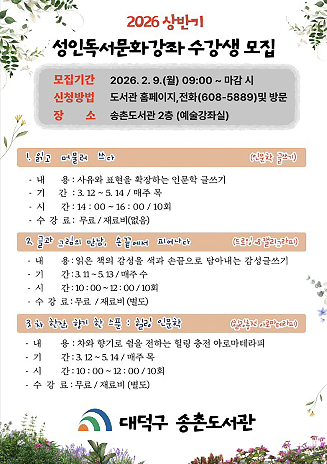 대전 대덕구 송촌도서관, 성인 대상 봄맞이 독서문화강좌 수강생 모집