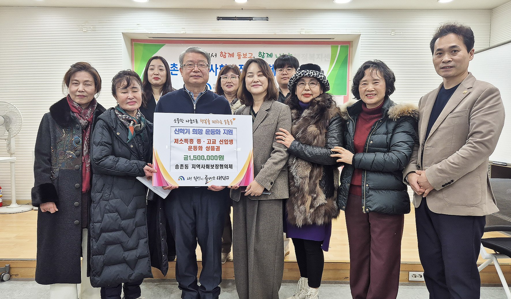 대전 대덕구 송촌동 지역사회보장협의체, 신입생 새출발 응원 저소득층 중·고교 신입생 10명에 운동화 상품권 지원 대전 대덕구 송촌동(동장 최은숙)은 11일 송촌동 지역사회보장협의체(위원장 윤기성)가 저소득층 중·고등학교 신입생을 위한 ‘신학기 희망 운동화 지원’ 전달식을 개최했다고 밝혔다. 운동화 지원 사업은 학업 환경 변화로 지출 부담이 큰 신입생 가정을 돕기 위해 4년째 이어지고 있는 송촌동 지역사회보장협의체의 특화사업이다. 실생활에 꼭 필요한 물품을 지원한다는 점에서 수혜자 만족도가 높다는 평가다. 올해는 사회복지공동모금회 지정기탁금을 활용해 청소년 10명에게 각 15만원 상당의 운동화 상품권을 전달했다. 윤기성 송촌동 지역사회보장협의체 위원장은 “작은 선물이지만 아이들에게는 큰 용기가 되길 바란다”며 “앞으로도 우리 지역 학생들이 더 큰 꿈과 희망을 가질 수 있도록 지속적인 관심과 지원을 이어가겠다”고 덧붙였다. 최은숙 송촌동장은 “청소년들이 행복하게 신학기를 맞이할 수 있도록 운동화를 지원해 주시는 지역사회보장협의체 위원들께 감사드린다”며 “앞으로도 복지 사각지대를 세심히 살피며 따뜻한 송촌동을 만들어 가겠다”고 밝혔다. [사진 설명 : 최은숙 송촌동장(사진 첫 번째 줄 왼쪽 네 번째)과 윤기성 송촌동 지역사회보장협의체 위원장(사진 첫 번째 줄 왼쪽 세 번째), 송촌동 지역사회보장협의체 위원들이 11일 저소득층 중·고등학교 신입생을 위한 ‘신학기 희망 운동화 지원’ 전달식을 마친 후 기념 촬영을 하고 있다.] |
