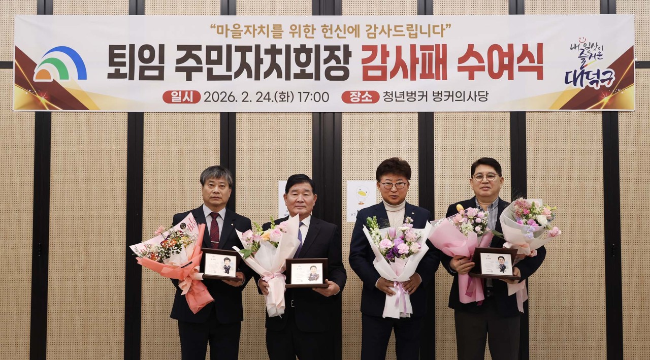 대전 대덕구, 퇴임 주민자치회장 감사패 수여 오정·회덕․신탄진동 3명 대상… 주민참여 확대·마을자치 활성화 공로 인정 대전 대덕구가 퇴임 주민자치회장 3명에게 감사패를 수여했다. 구는 청년벙커의사당에서 감사패 수여식을 열고 주민자치 활성화와 지역 발전에 기여한 공로를 기렸다. 감사패 수여 대상자는 이규영 오정동 회장, 이형주 회덕동 회장, 홍석표 신탄진동 회장 등 3명이다. 이들은 재임 기간 동안 주민 참여 기반 확대, 마을 의제 발굴과 실행, 주민 화합 프로그램 운영 등 다양한 주민자치 활동을 추진하며 지역사회 자치역량 강화에 기여했다. 특히 주민 스스로 지역 문제를 발굴하고 해결하는 참여형 자치 모델 정착에 중요한 역할을 수행했다. 또한 마을 공동체 회복과 주민 간 소통 활성화에도 앞장서 지역사회에 긍정적인 변화를 이끌어냈다는 평가를 받고 있다. 대덕구 관계자는 “주민자치 현장에서 묵묵히 헌신해 주신 세 분 회장님의 열정과 봉사가 지역 공동체를 더욱 단단하게 만들었다”며 “그동안의 노고에 깊이 감사드리며 앞으로도 지역 발전을 위한 든든한 조언자로 함께해 주시길 바란다”고 말했다. [사진 설명 : 최충규 대덕구청장(사진 왼쪽 세번째)과 이규영 오정동 주민자치회장, 이형주 회덕동 주민자치회장, 홍석표 신탄진동 주민자치회장이 ‘감사패 수여식’을 마친 후 기념촬영을 하고 있다.] |