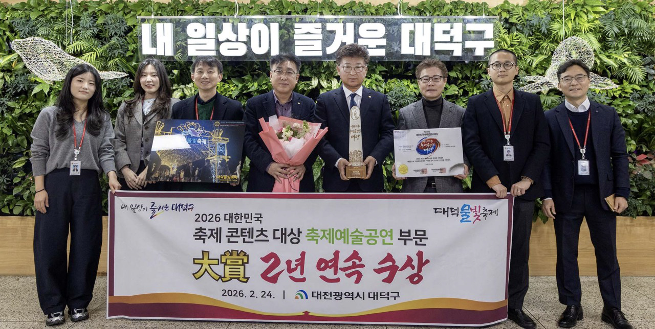 ‘대덕의 쾌거, 대전의 자랑’ 대덕물빛축제, 대한민국 축제 콘텐츠 대상 3년 연속 수상 축제문화·예술 부문 2년 연속 대상… 전국구 대표 축제 위상 재확인 고래설화 기반 야간경관·뮤직페스티벌·드론쇼 등 차별화 콘텐츠 호평 대전 대덕구의 대표 브랜드 축제인 ‘대덕물빛축제’가 대한민국을 대표하는 축제로서의 위상을 다시 한번 입증했다. 대덕구는 대덕물빛축제가 최근 발표된 ‘제14회 대한민국 축제콘텐츠 대상’에서 축제문화·예술 부문 2년 연속 대상을 수상했다고 밝혔다. 특히 2024년 특별상 수상을 시작으로 3년 연속 수상이라는 성과를 거두며, 대전광역시 4년 연속 대표축제 선정과 함께 전국적 인지도를 공고히 하고 있다. ‘대한민국 축제콘텐츠 대상’은 (사)한국축제콘텐츠협회가 주관하는 상으로, 축제의 차별성, 콘텐츠 완성도, 지역경제 활성화 기여도 등을 종합 평가해 수여한다. 대덕물빛축제는 대청호의 ‘고래설화’를 현대적 감각으로 재해석한 독창적 세계관과 차별화된 야간 콘텐츠에서 높은 평가를 받았다. 구는 이번 성과를 바탕으로 오는 4월 4~5일 이틀간 대청공원 일원에서 ‘2026 대덕물빛축제’ 메인 행사를 개최한다. 3년 연속 수상의 품격에 걸맞은 한층 강화된 프로그램을 선보일 예정이다. 올해 축제에서는 △5개의 고래 테마 야간 조형물 △국내 정상급 아티스트가 참여하는 뮤직페스티벌 △전 세대가 함께하는 효 콘서트 △드론라이트쇼와 불꽃놀이 등 오감을 만족시키는 콘텐츠를 준비하고 있다. 또한 기업홍보관 운영을 확대해 방문객의 소비 동선을 인근 상권과 관광지로 연계하고, 축제의 경제적 효과가 지역 전반으로 확산되도록 할 계획이다. 대덕구 관계자는 “3년 연속 수상이라는 영예는 축제를 함께 만들어 온 구민과 직원들의 끊임없는 혁신 노력이 만들어낸 결과”라며 “오는 4월, 대청호의 물빛과 고래의 꿈이 어우러지는 대덕물빛축제를 통해 전국 방문객들에게 대덕구만의 차별화된 문화 에너지를 선보이겠다”고 포부를 밝혔다. [사진 설명 : 최충규 대덕구청장(사진 왼쪽 다섯 번째)과 대덕구 직원들이 ‘제14회 대한민국 축제콘텐츠 대상’ 축제문화․예술 부문에서 대상을 수상한 후 기념 촬영을 하고 있다.] |